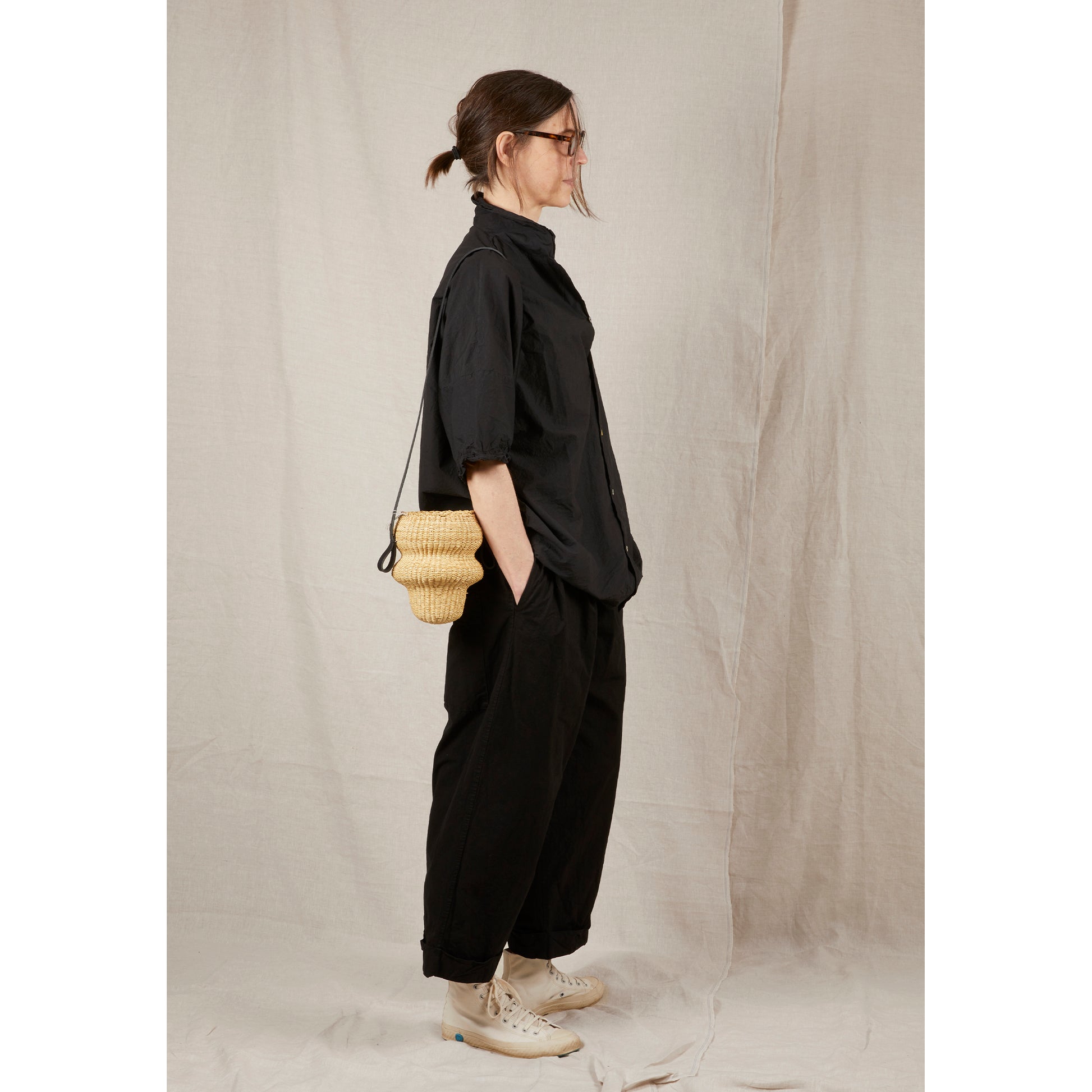 Inès Bressand is a Marseille-based designer whose minimal, yet playful basket bags are as much sculptural objects as they are everyday accessories. Originally developed during a research trip to Ghana, the baskets are hand-woven by independent Ghanaian artisans, before being artfully sculpted and pleated into shape in Bressand's atelier where the vegetable-tanned leather accents are also added.