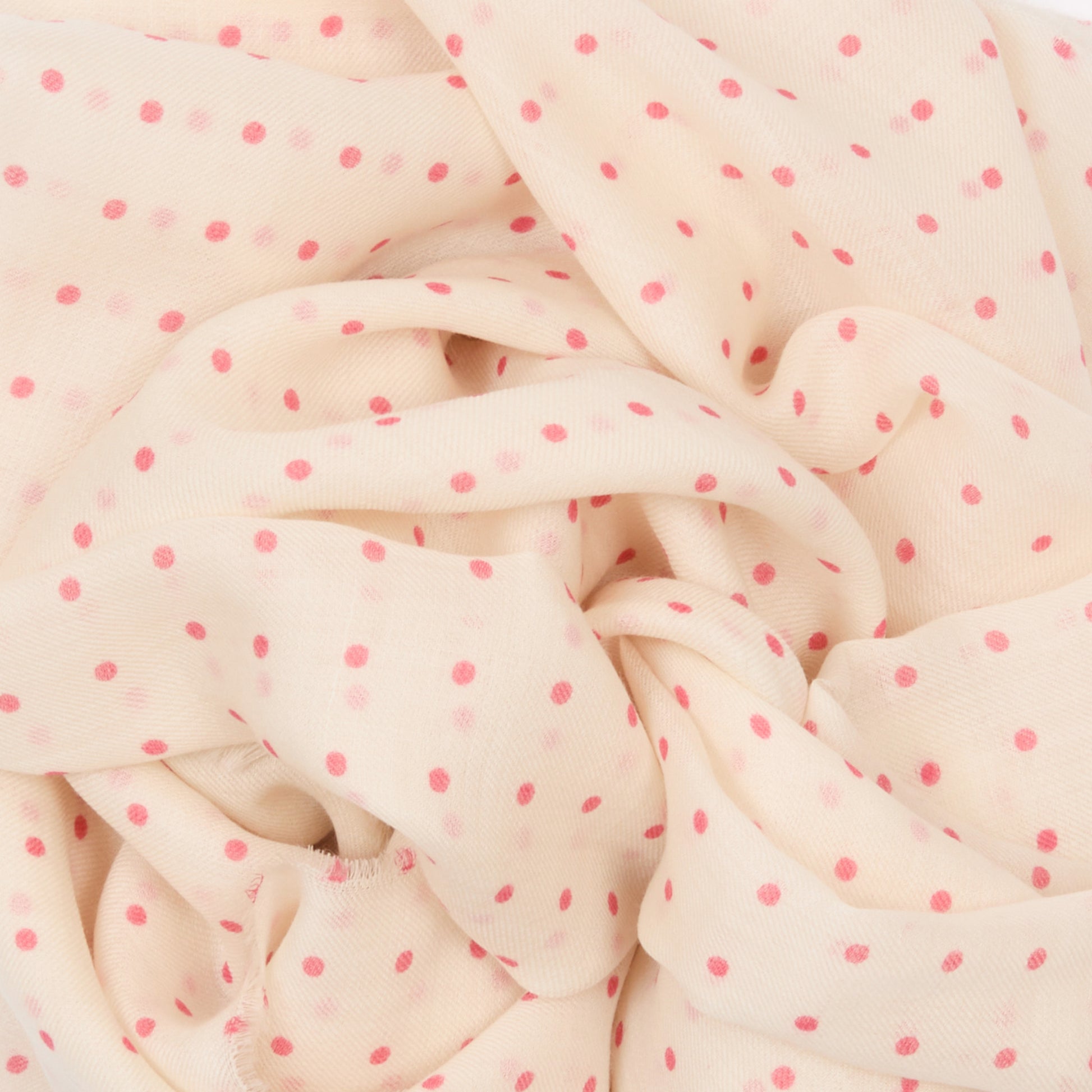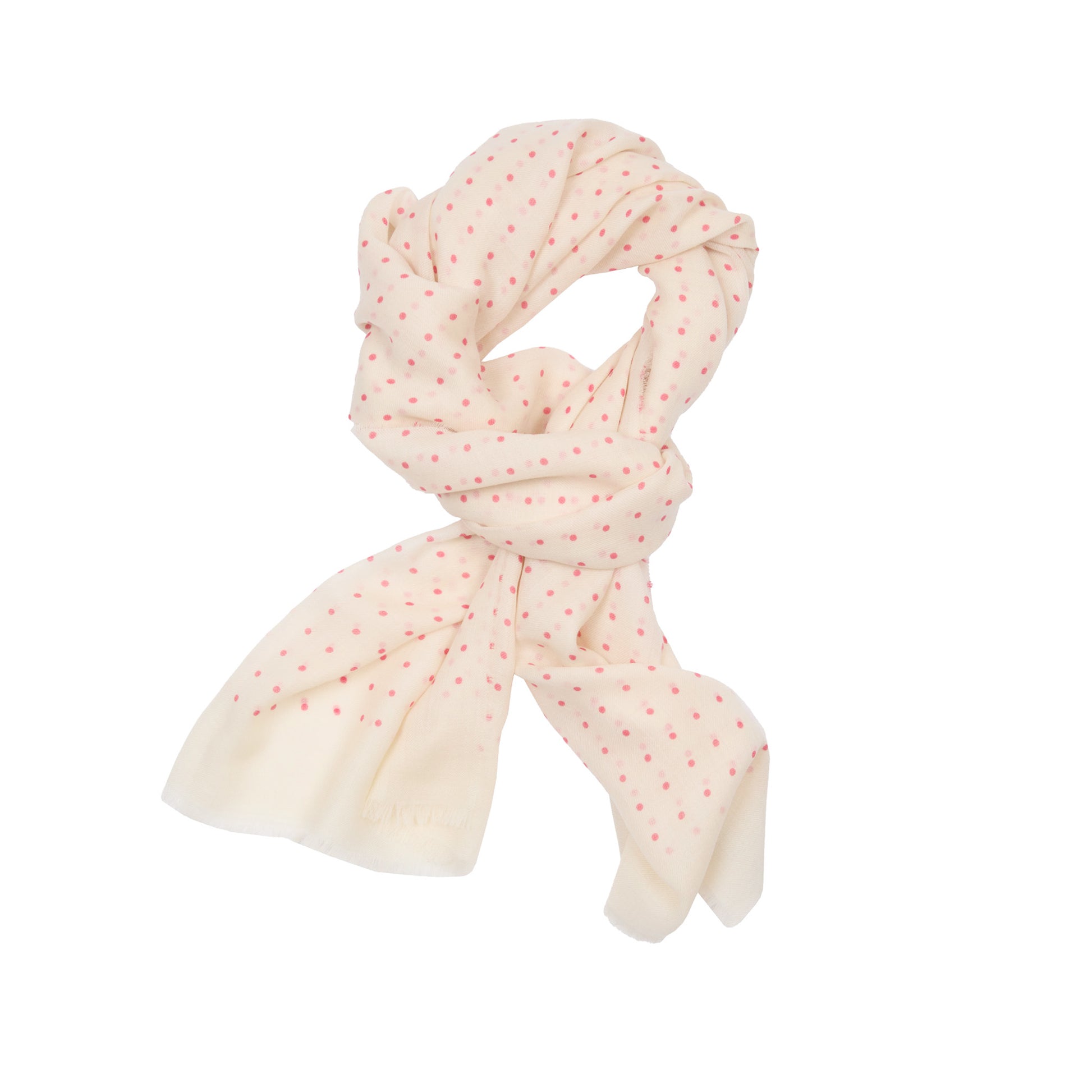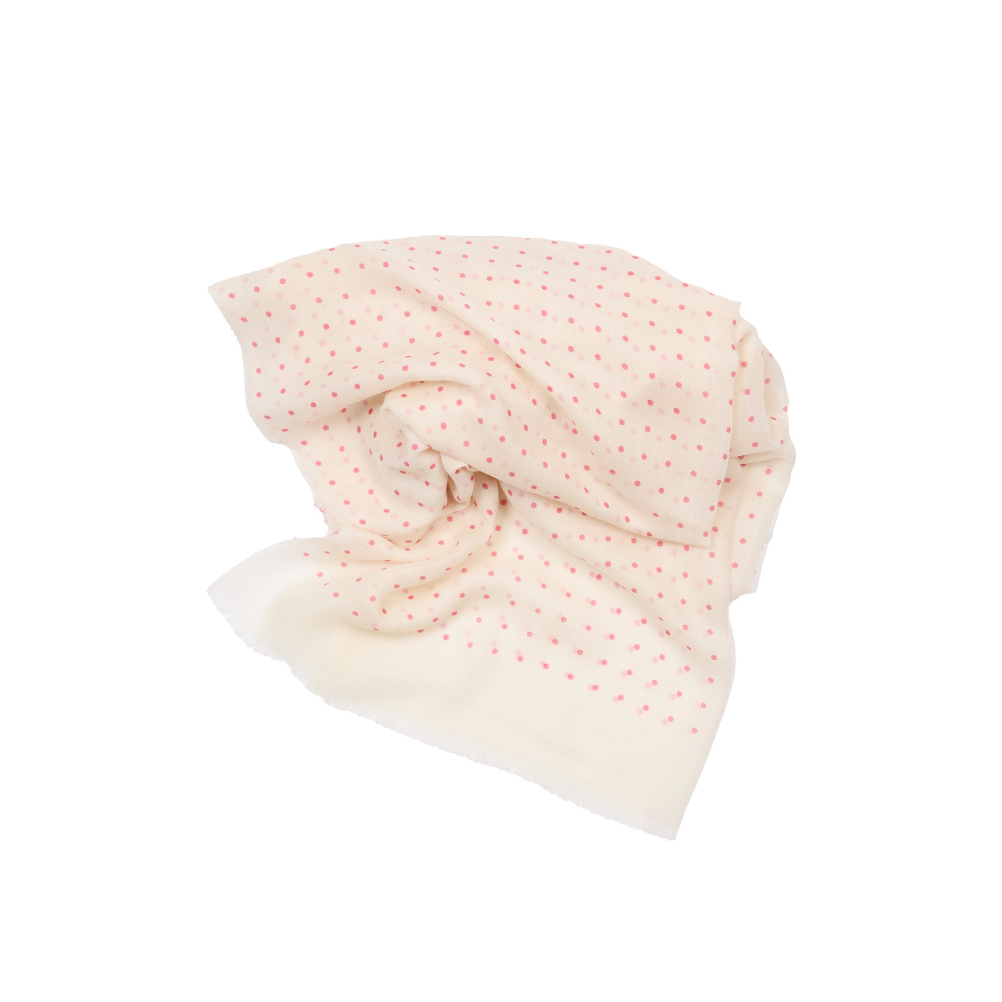 A lightweight cashmere scarf with polka dot pattern and frayed edges. This superfine scarf contains 8 km of fine gossamer yarn from goats in the Alashan region of Inner Mongolia.