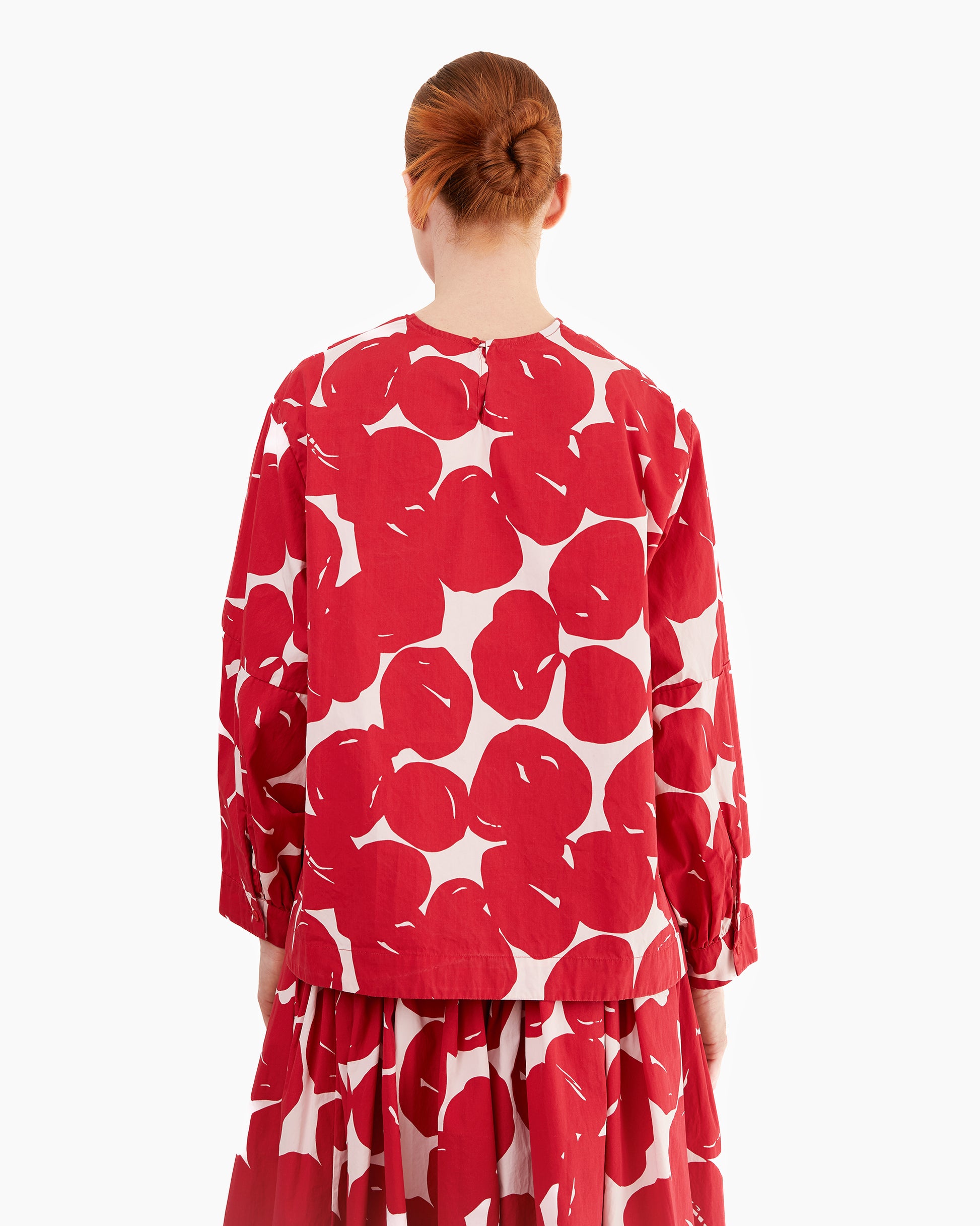 Biggy Top in Cot Pop Print; lightweight and breezy cotton poplin shirt in a fun cot pop print. Round neck top with a neckline that closes with a button at the back. Featuring gathered button cuffs and a slightly longer back for a relaxed fit. Matching skirt available.