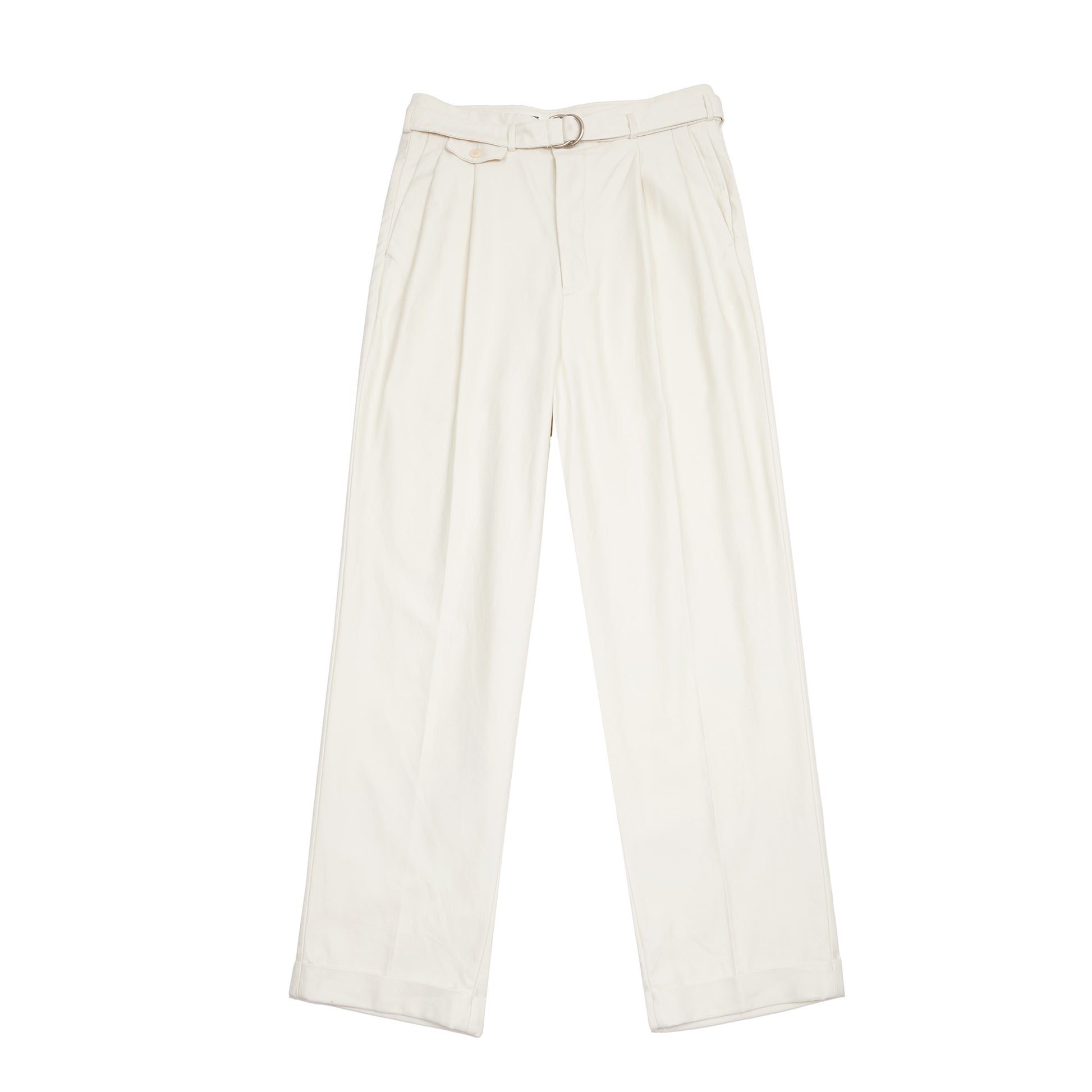 Relaxed double-pleated trouser in soft midweight cotton fabric, including a matching removable cotton cloth belt and featuring a cuffed hem. An elevated casual trouser for spring and summer.