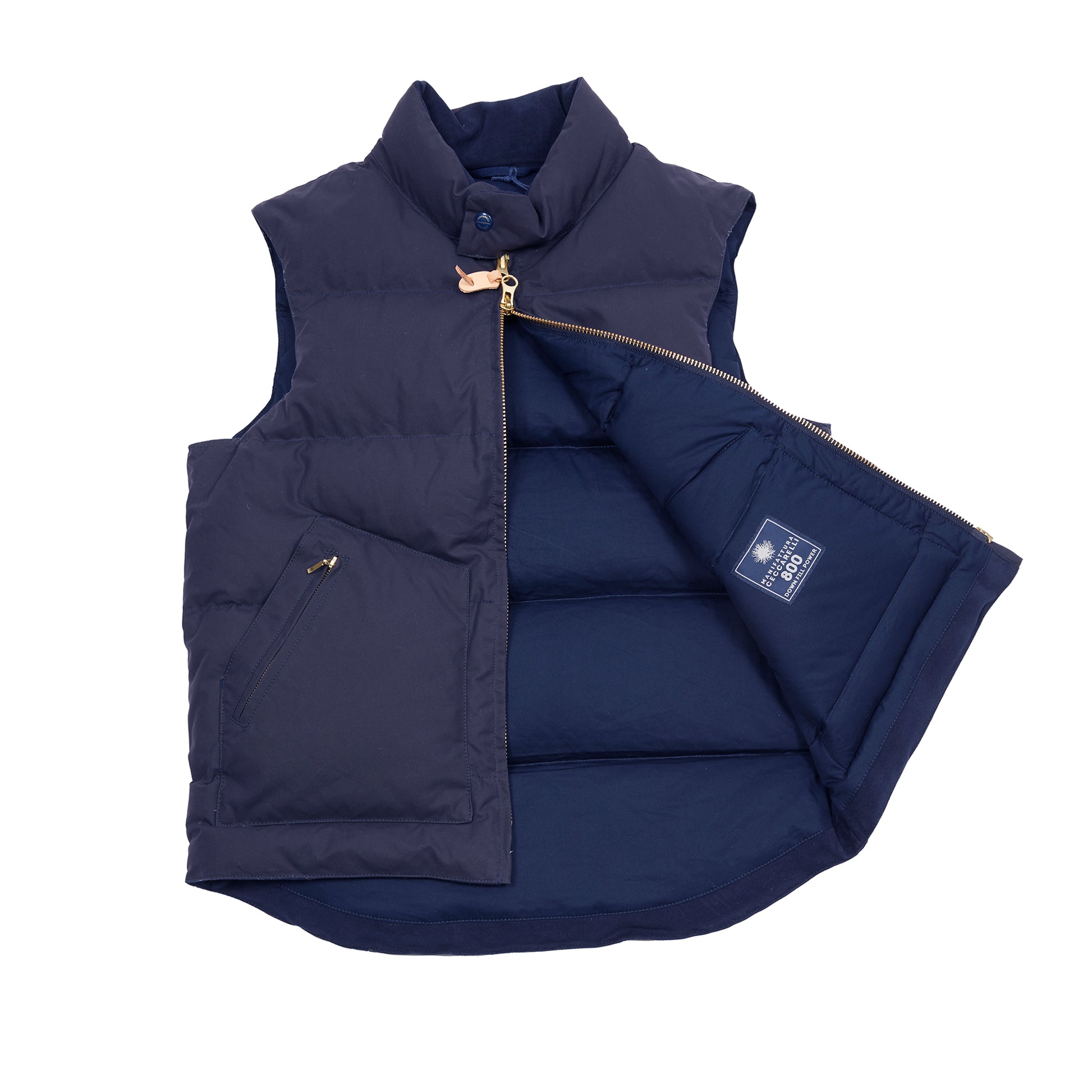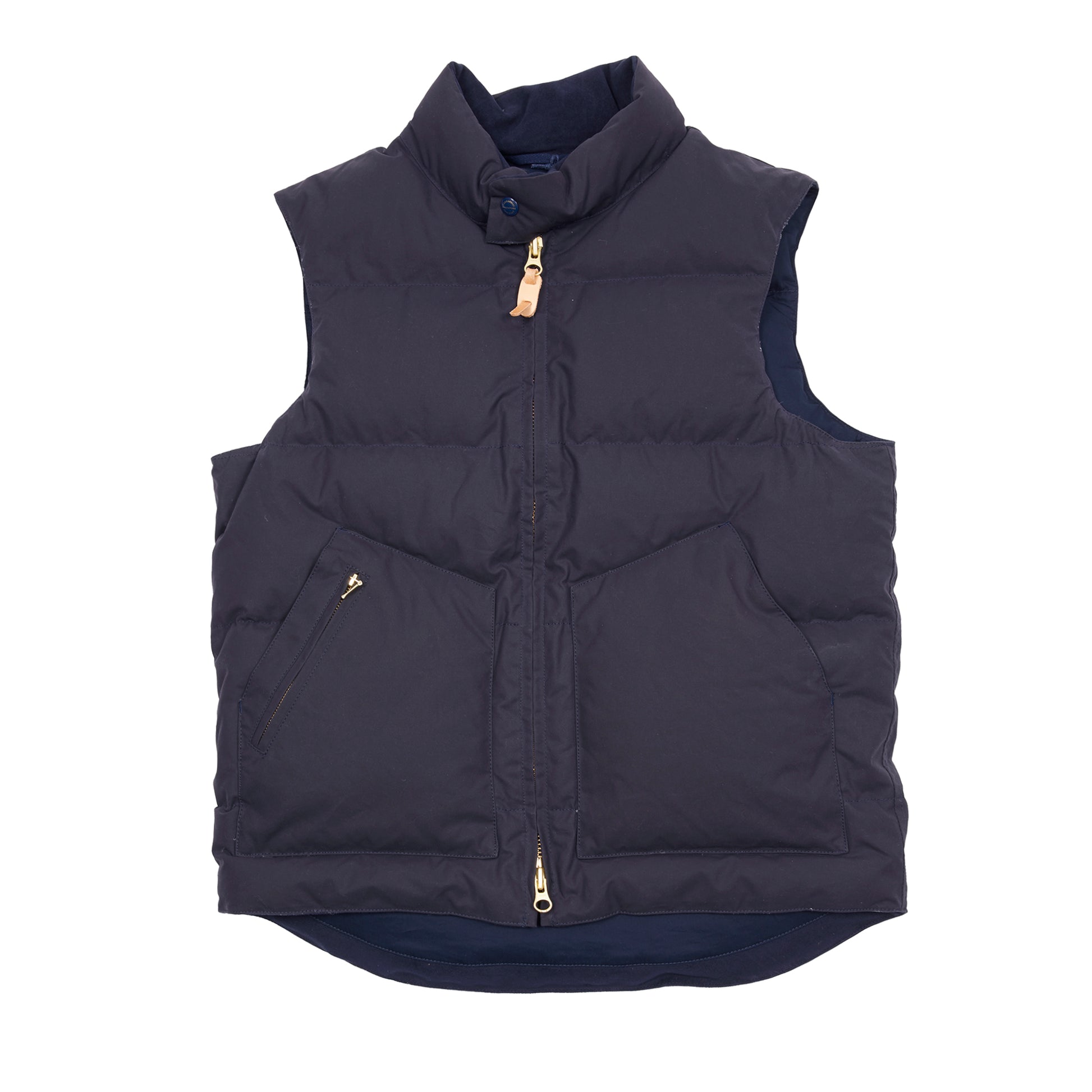 Goose down Vest in Navy featuring front patch pockets with one having an extra zipped pocket, collar with snap button closure, and a two-way zip for maximum comfort. The outer fabric is crafted from water-resistant waxed cotton and the goose down has a fill power of 800, to keep you dry and warm.