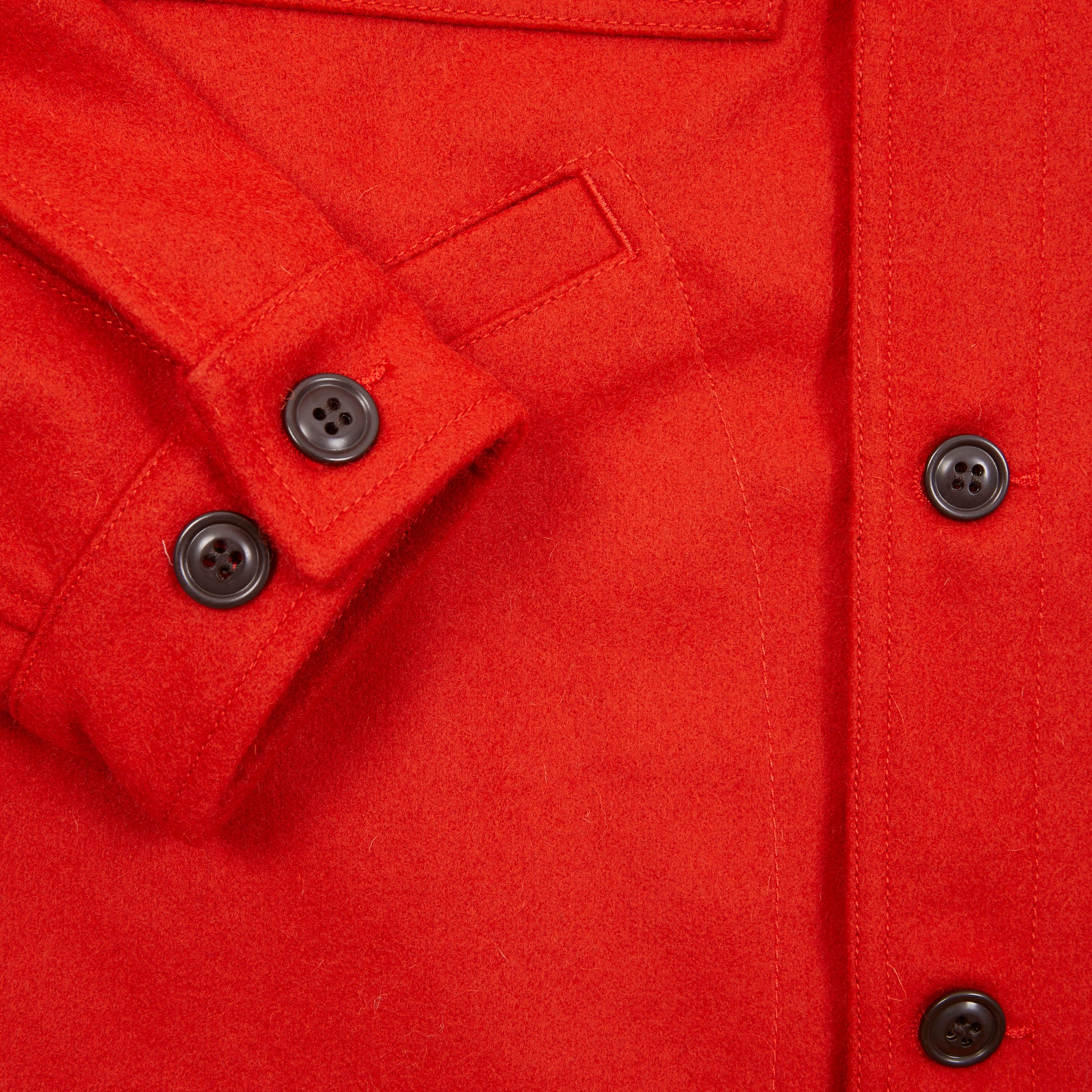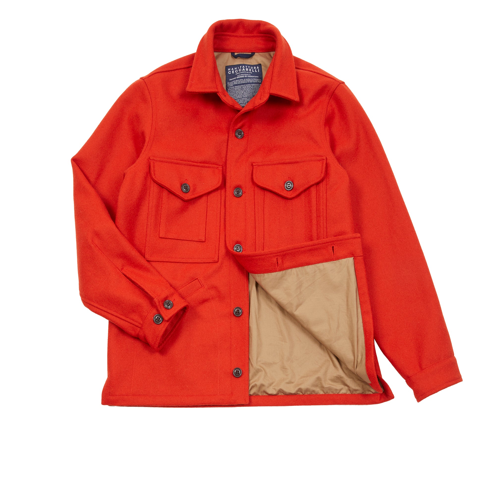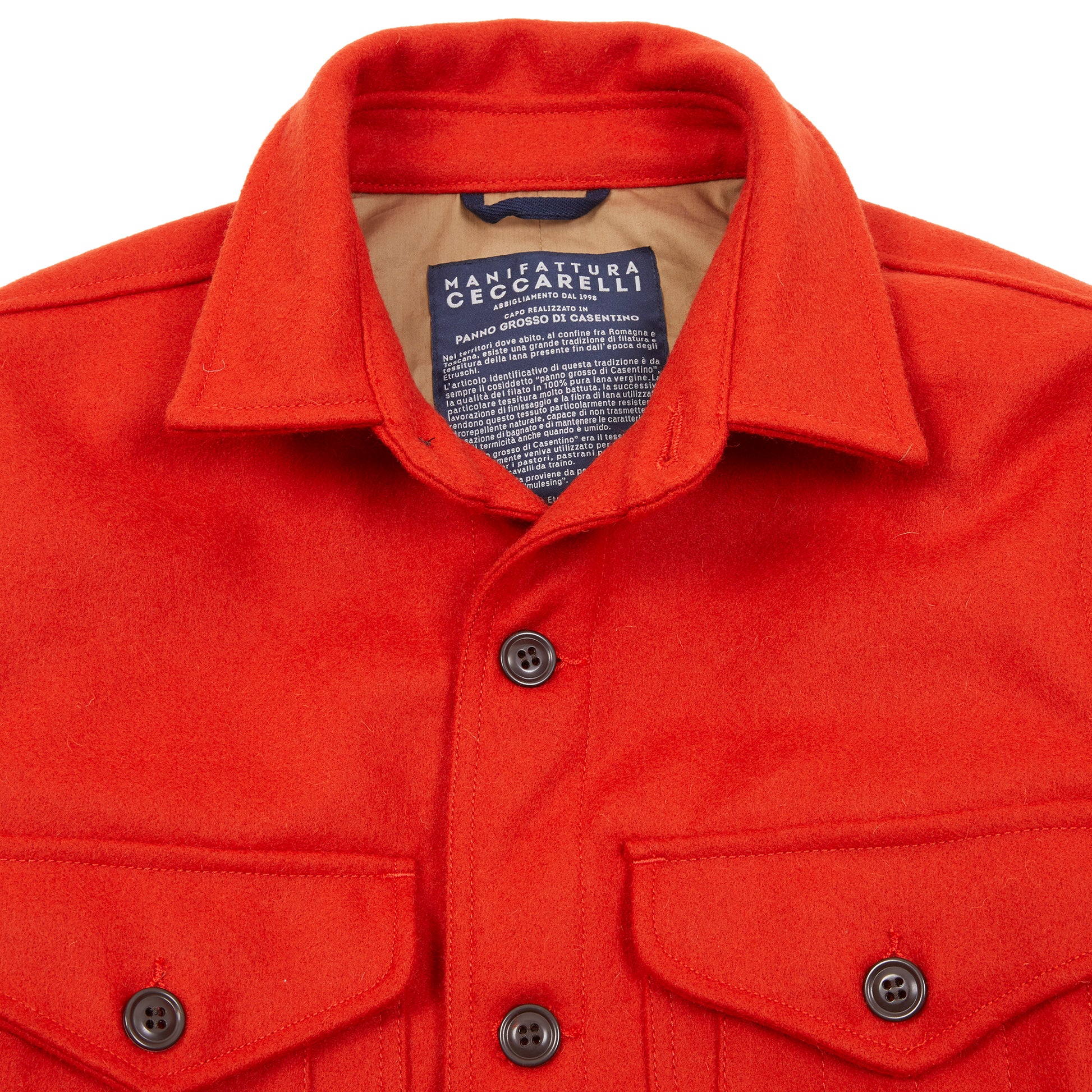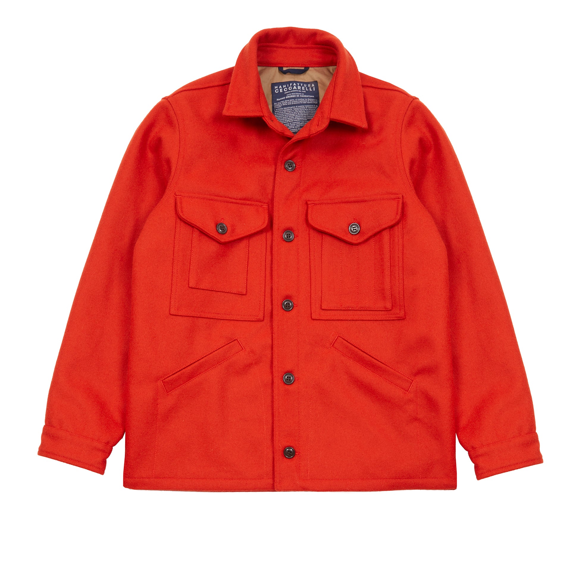 Cruiser Jacket in 'Panno Grasso di Casentino' Virgin Wool. This style is reminiscent of a 1930s shirt-jacket featuring short pointed collar, four-button closure, two patch chest pockets with two having button-flap closure, and slanted side pockets, made from warm, durable, and naturally water-repellent Casentino Wool.