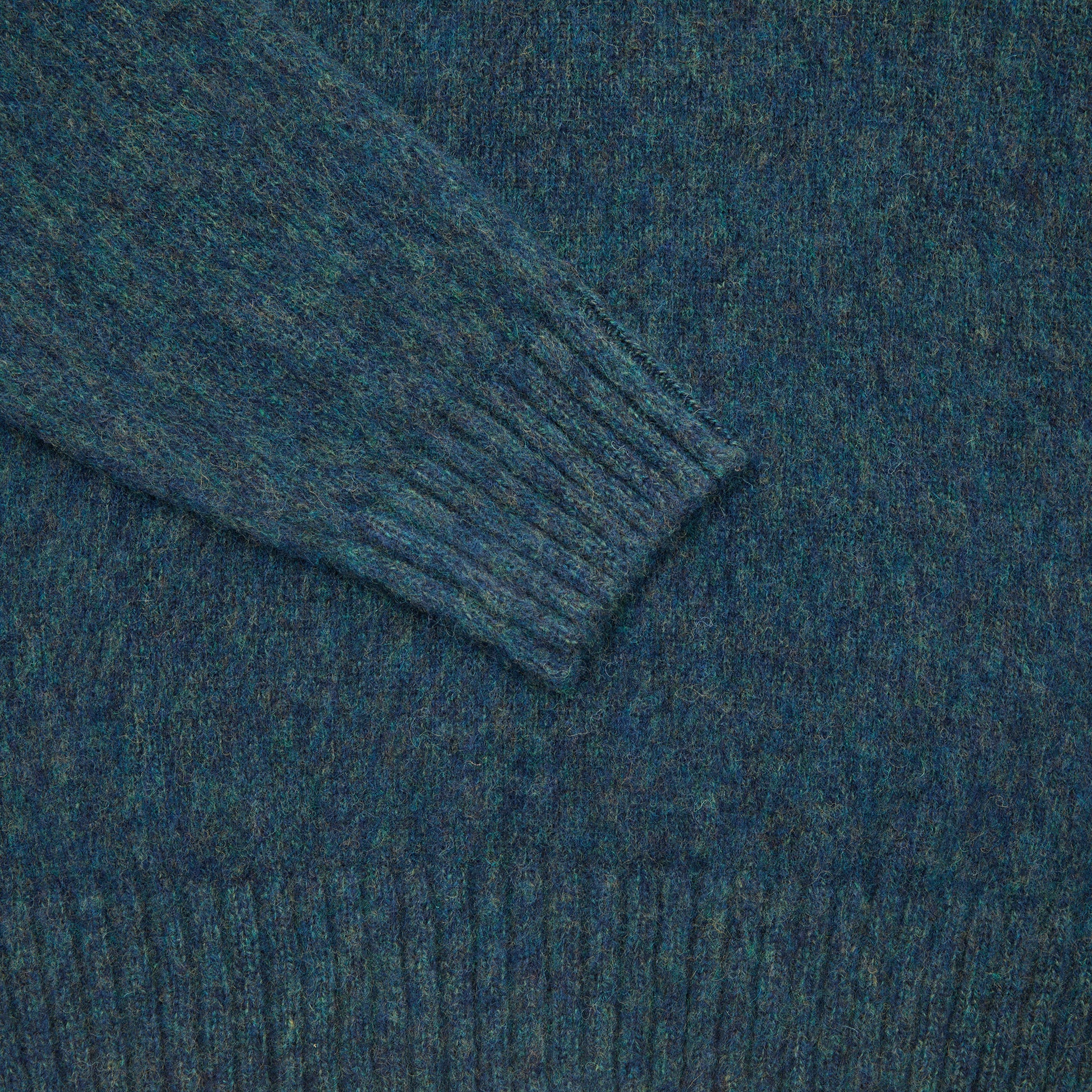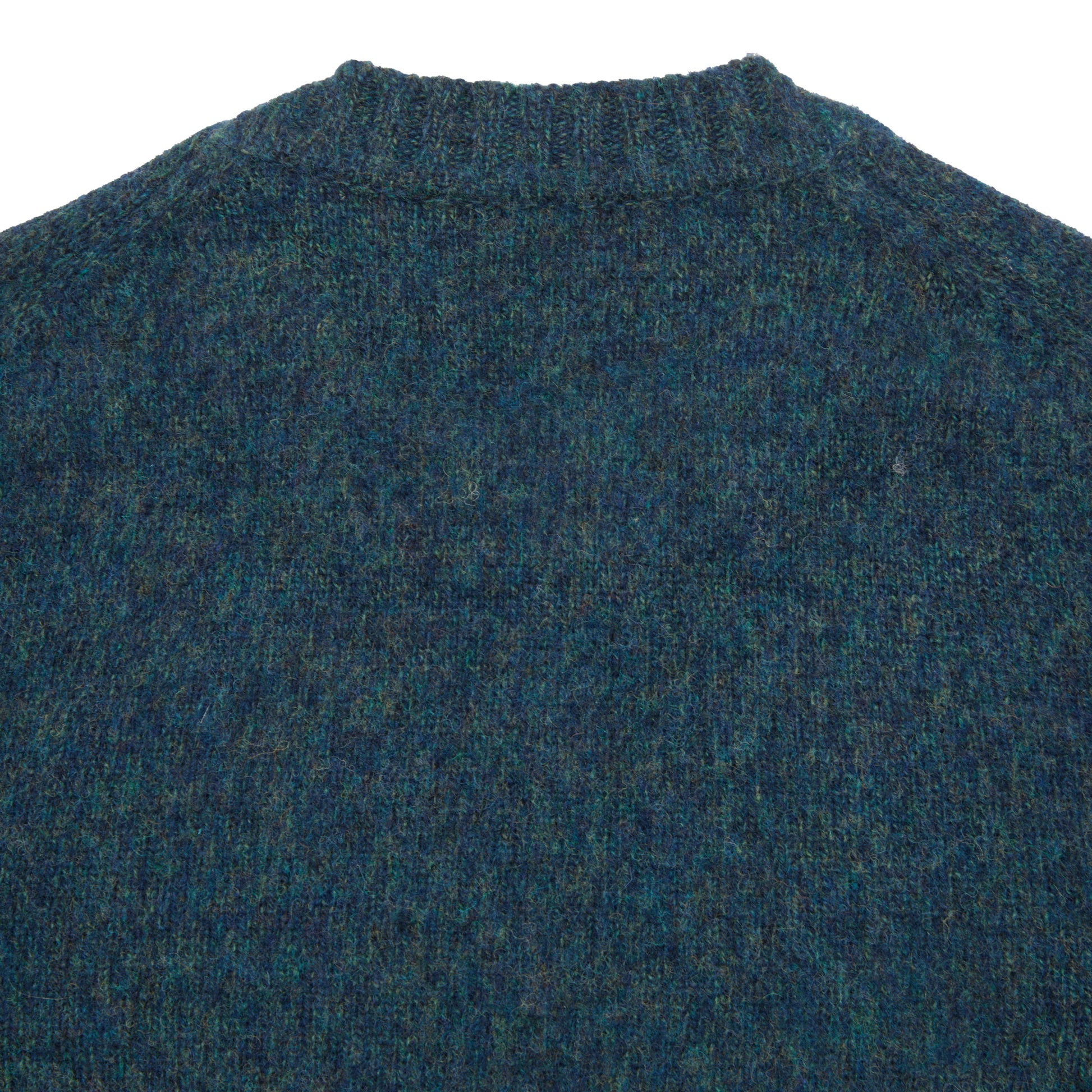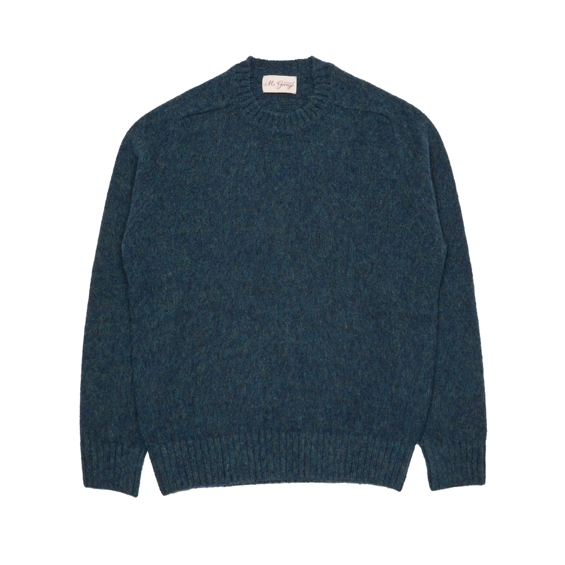 Classic shaggy mid-weight crewneck jumper with ribbed cuffs and collar in a soft brushed Supersoft Shetland-style wool spun in Italy.