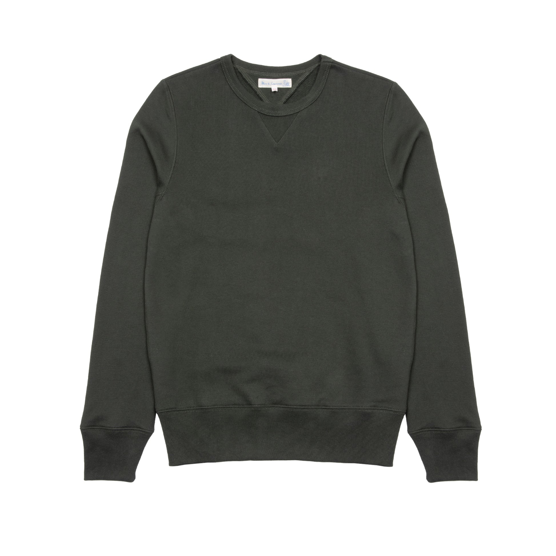 Lightweight Loopwheeled sweatshirt, featuring double V gussets, wide waistband, set in shoulders, side seams and underarm gussets. The trimmings, cotton fabrics, buttons, labels, hangtags, and packaging are all German-made.