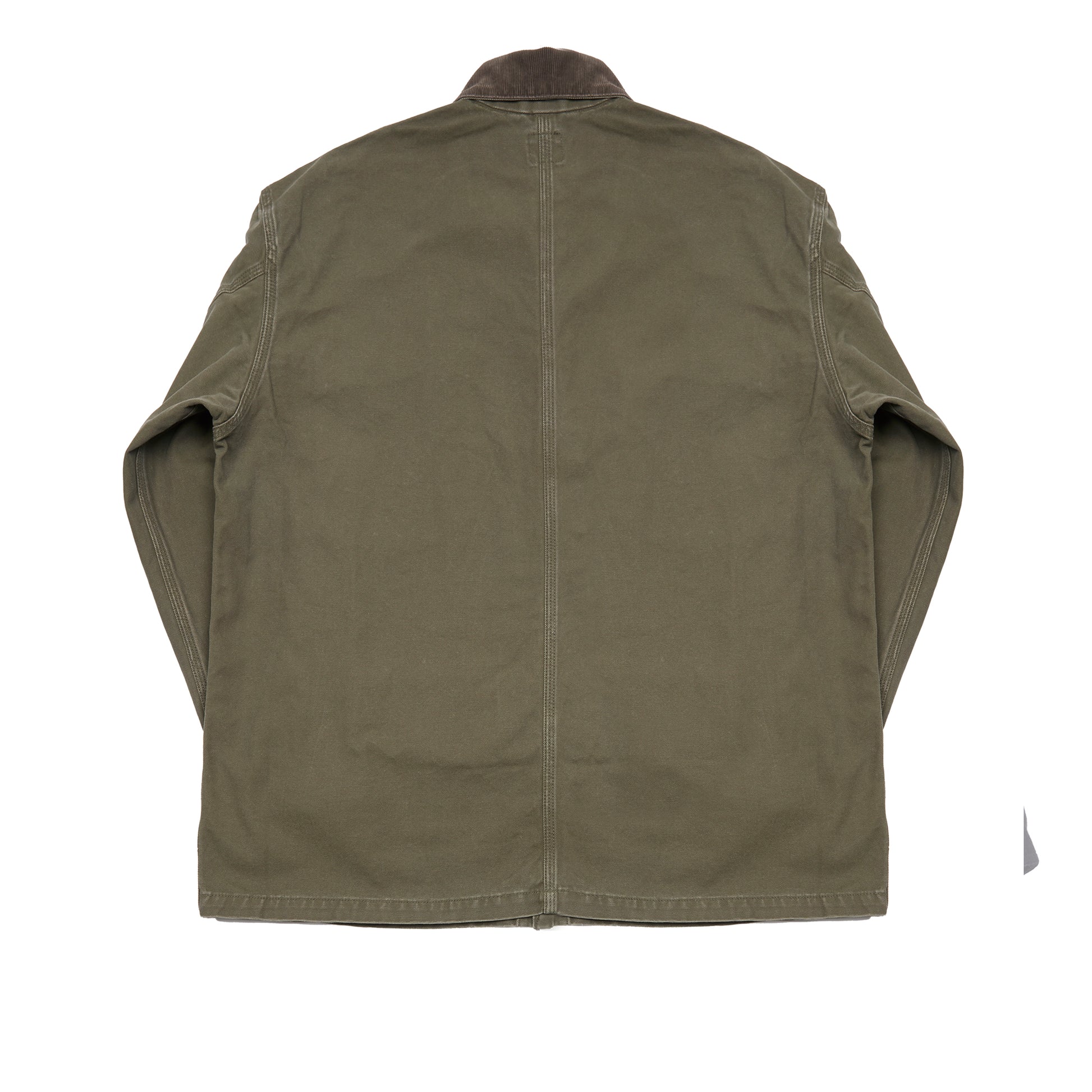 Relaxed Fit Coverall in Army Green based on a historic design in 100% heavy twill cotton featuring contrast corduroy collar, workwear pockets and sleeve.