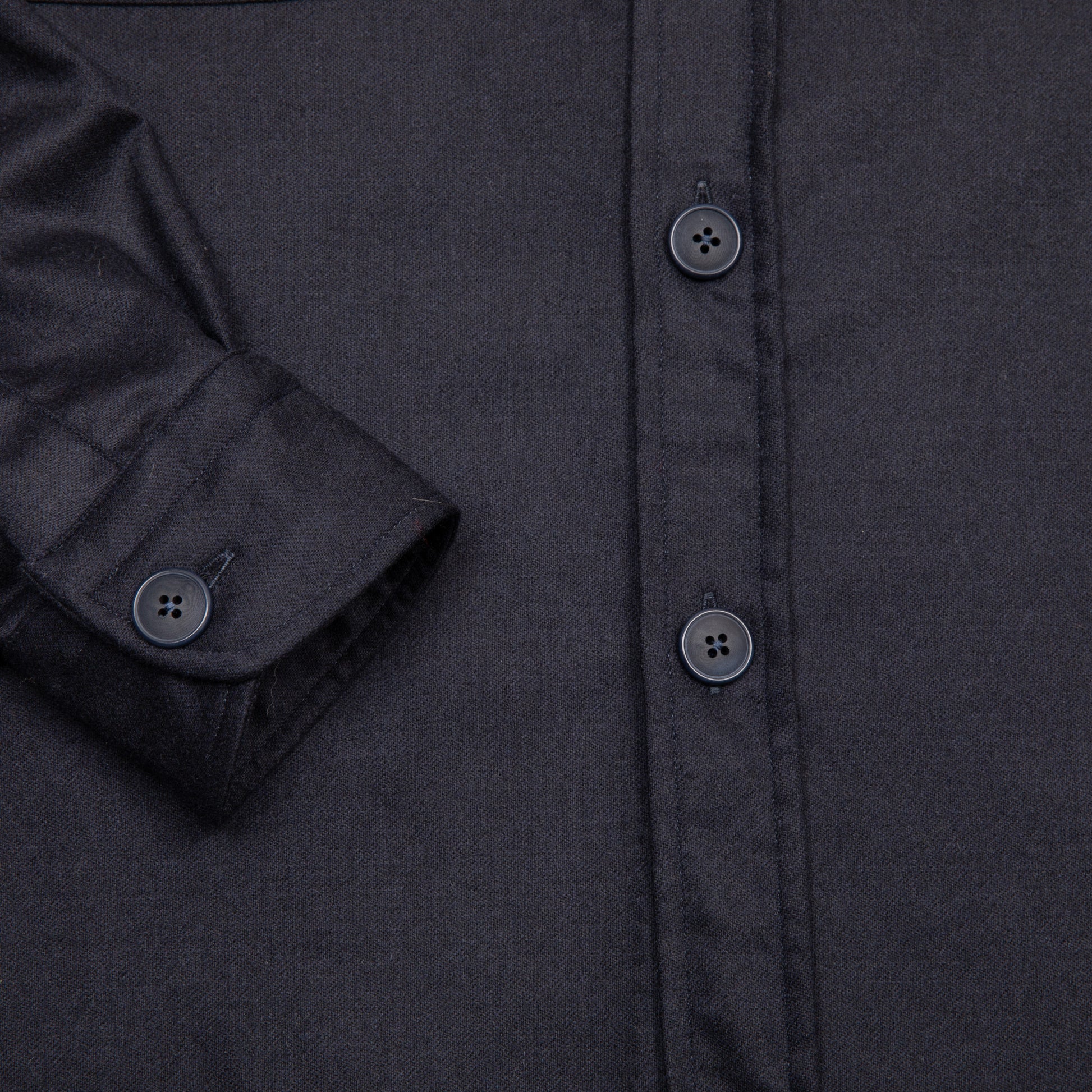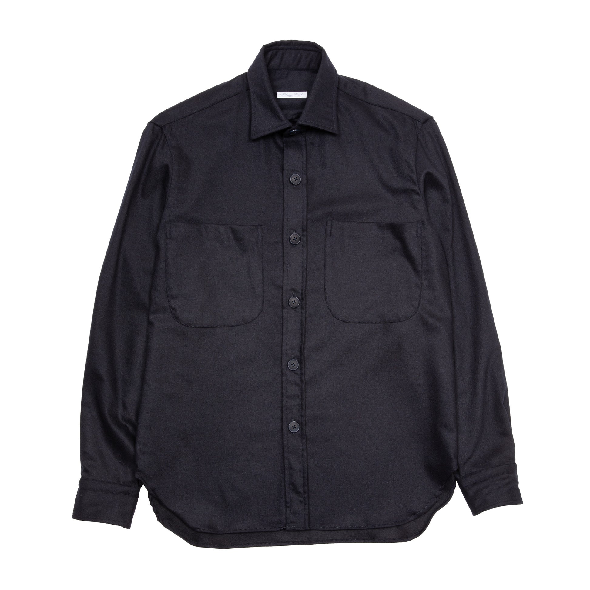 Elevated overshirt in a light, luxurious, and lustrous virgin wool/cashmere blend, featuring two chest pockets and single-button cuffs.